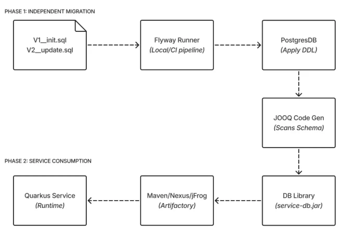 The library strategy: Once migrations are applied, we generate the JOOQ classes and package them into a versioned library (e.g.,