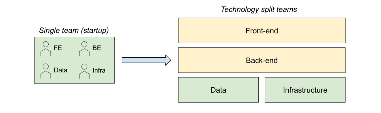 Most teams quickly outgrow the technology-split model as the natural cut point resulting from team growth creates more teams of the same type, e.g., multiple back-end teams, multiple front-end teams all with the same mandate. This requires increased communication and coordination which decreases productivity. The preferred model most companies adopt is a combination of vertical and horizontal teams which take a few different forms: